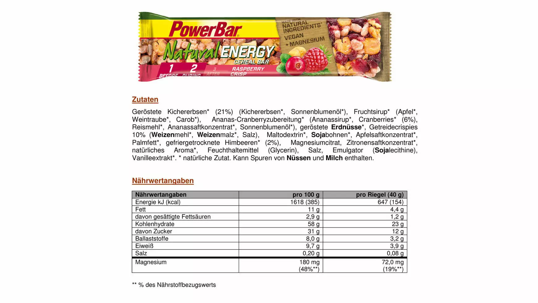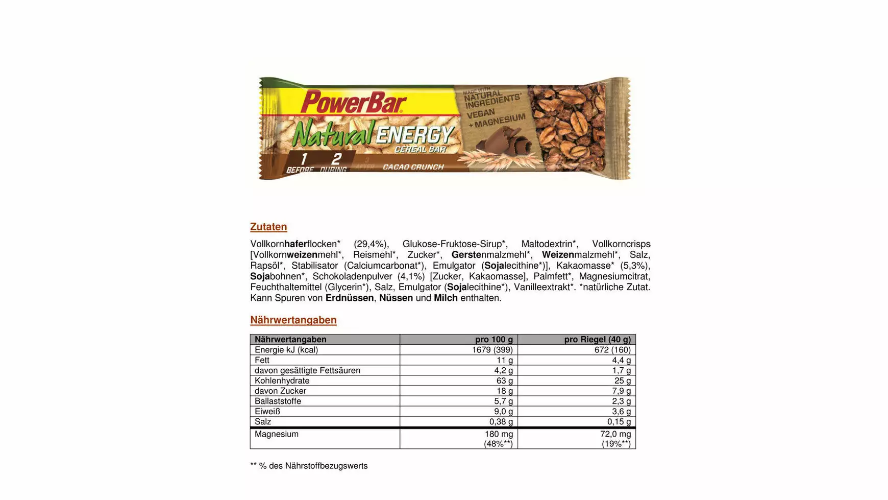 Wenn du draußen mal wieder länger unterwegs bist oder noch eine Trainingseinheit später am Tag planst, willst du deinen erhöhten Energiebedarf mit leckeren, natürlichen Produkten decken. Diese sollten beim Sport gut verträglich sein. Deshalb hat PowerBar den NATURAL ENERGY CEREAL Riegel entwickelt. Der kohlenhydrathaltige Sportriegel wird hergestellt aus Vollkorn-Haferflocken sowie anderen leckeren, natürlichen Zutaten wie Fruchtstückchen, Kürbiskernen oder Kakao. Zutaten und Nährwerte finden Sie unter den Detailbildern