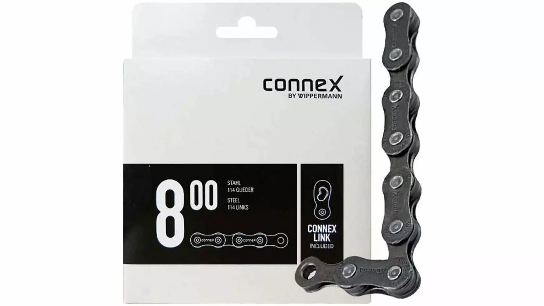 Die Connex-Wippermann Fahrradkette 800 ist geeignet fĂĽr alle gängigen 6 bis 8-fach-Schaltsysteme und schmale 3/32″ Singlespeed Antriebe, MaĂź: 1/2″ x 3/32″, Bolzenlänge: 7,2 mm, 114 Glieder inkl. Verschlussglied Connex Link, Farbe: grau, Gewicht: 308 g/110 Glieder. OEM-verpackt (kommt ohne Umverpackung/ Karton).